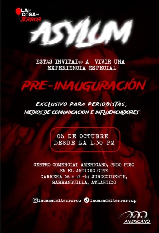 Asylum, como será llamada esta temporada de la Casa del Terror, estará recreando una historia donde se esconden personajes, escenas espeluznantes y pasadizos dentro de una clínica Psiquiátrica, en la cual transcurrirán sucesos de espanto y terror inesperados para sorprender y asustar a sus visitantes. Ubicado en el centro comercial Americano, el montaje de esta escalofriante experiencia inmersiva estará diseñada para esconder entre sus pasillos los sustos más insospechados para el ojo humano.