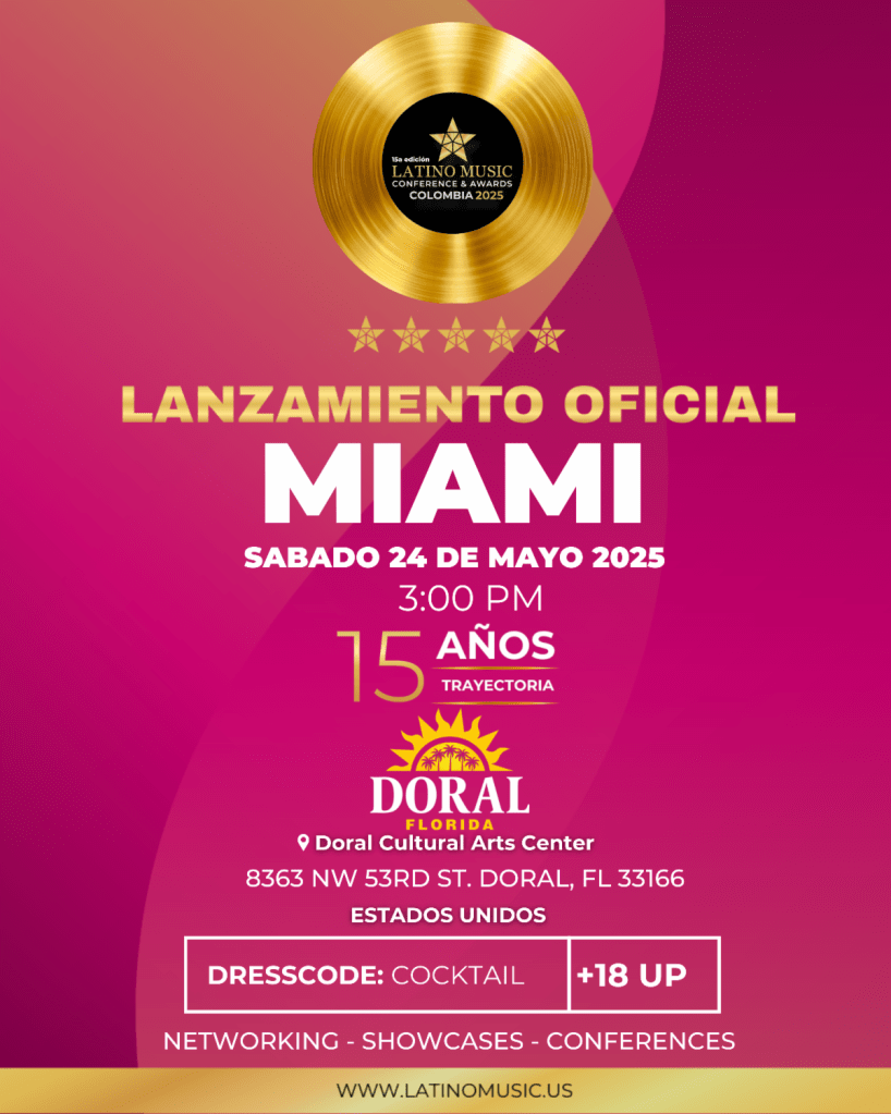 Este próximo 24 de mayo, la industria de la música tiene una cita en el gran lanzamiento de la 15a edición de los LATINO MUSIC AWARDS 2025 en la ciudad de Miami, un evento donde se reunirán diferentes personalidades de la industria de la música y el entretenimiento, artistas y medios de comunicación, para conocer todos los detalles de la programación y como participar en la gran gala de premiación de los premios más importantes de la música en Colombia, los cuales logran generar uno de los espacios de networking y visibilidad más importantes para la industria musical, al cual asisten empresarios de más de 12 países, medios, managers, sellos disqueros y diferentes marcas que hacen parte del ecosistema de la industria musical.