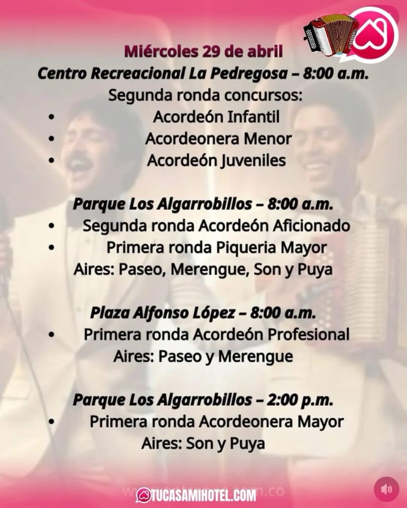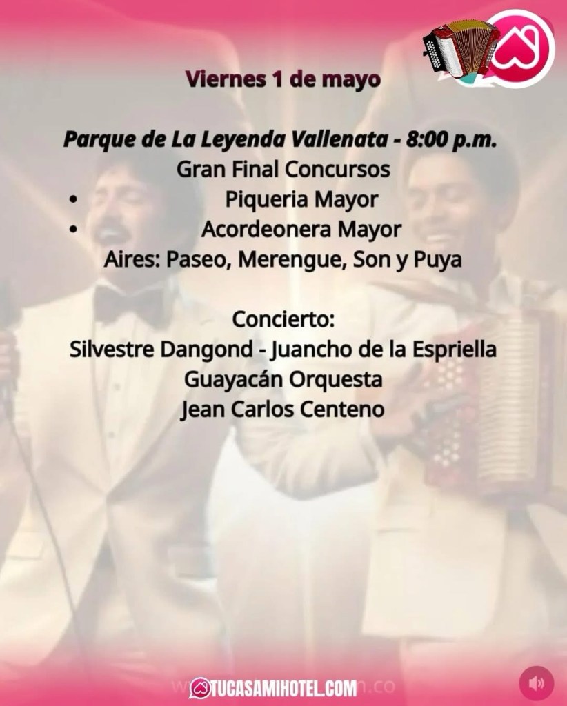 Durante los últimos días de abril y comienzos de mayo, el festival presenta una programación que integra concursos tradicionales, conciertos de gran formato y actividades culturales que exaltan el legado del acordeón. Este año, la edición rinde homenaje al histórico Binomio de Oro de América, reconociendo su aporte a la evolución y popularización del género.